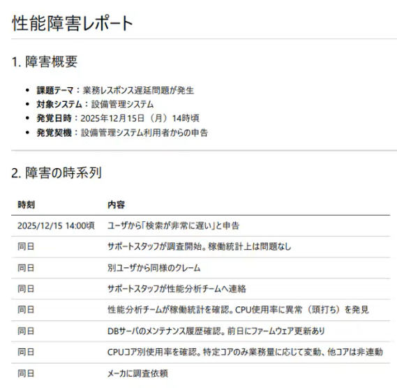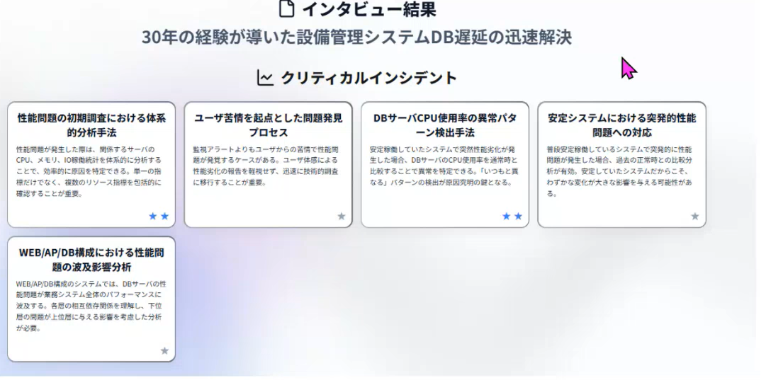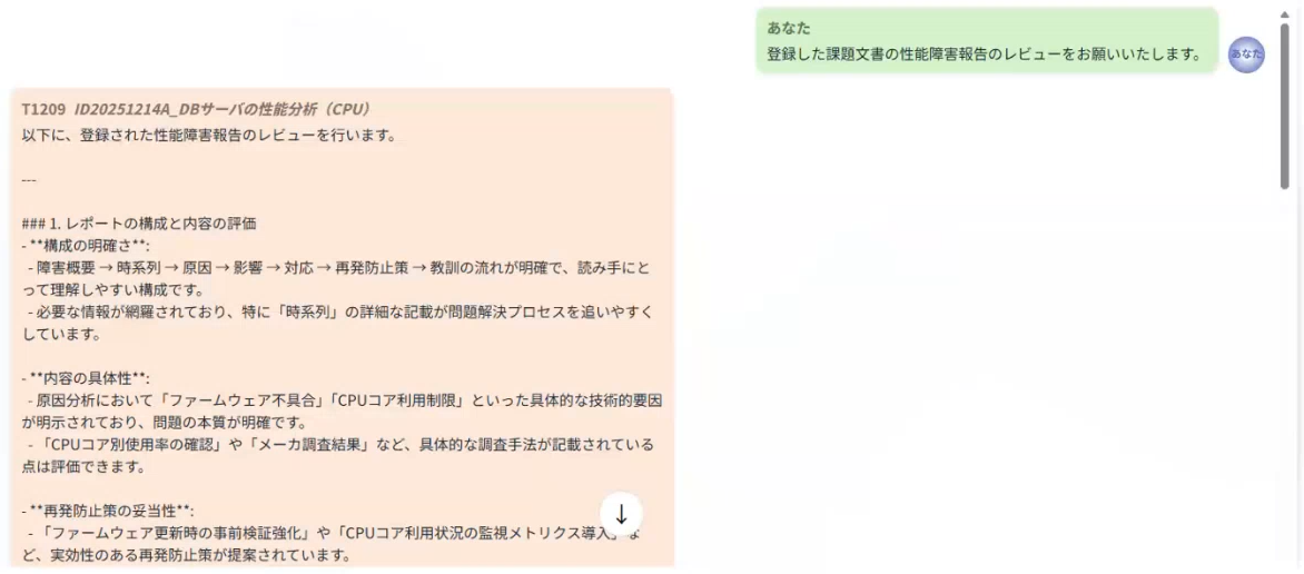 障害報告書のレビューのように、FAQでは表現できない暗黙知を判断プロセスとして整理し、段階的に深掘りする過程は必要不可欠である。有識者のナレッジを反映したAIの支援により、若手が1人で対応しながら成長する機会が生まれ、生産性向上のみでは終わらず組織全体の持続的な成長を支える存在となりつつある。