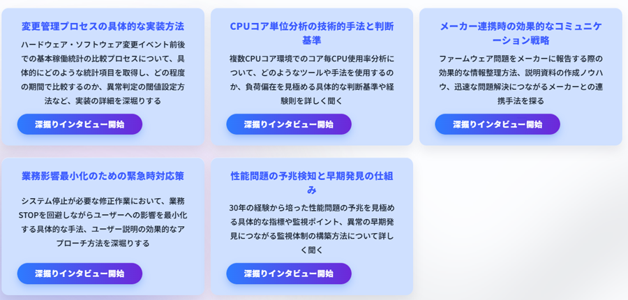 住友「Seiko Futureworksは知識ベース型AIとして体系化された専門家の知識を活用し、IPA(独立行政法人 情報処理推進機構)が公開しているITストラテジストシラバスの知見を持つAI人格をデフォルトで搭載しつつ、不足部分は暗黙知で補いながら回答を導きます。AIインタビュアーは、CIT(クリティカルインシデントテクニック)に基づき過去の成功・失敗の経験に焦点を当てたインタビューを行い、感情面まで含めて引き出すことで、経験を単純なFAQではない深いナレッジとして整理します。感情的に高ぶったタイミングに着目することで、暗黙知を引き出すことができるのだと思います。15分程度のインタビューで得た内容を知識ベース化しレビューに反映できるため、実際のレビュアーの第一関門として活用可能だと考えています」