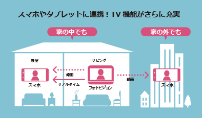 宅内遠隔視聴は、PhotoVision TV2で受信中のテレビ放送をスマホやタブレットでリアルタイムに視聴できる機能です。また、録画した番組もスマホに転送および保存をすることなく視聴することが可能です。テレビチューナの付いていない通信端末においてもテレビ視聴が可能になるため、寝室でくつろぎながらドラマを視聴する、浴室でスポーツ中継を観るなど、自宅でのテレビの楽しみ方が広がります。