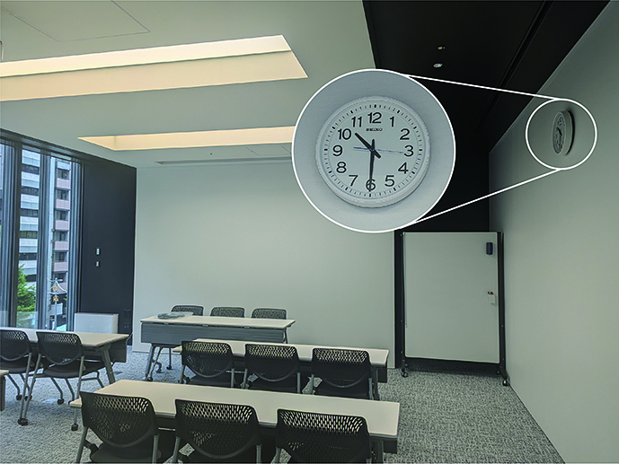 時計は主にタイムマネジメントの精度が求められる場所に設置しています。たとえば、3階の会議室には1室毎に1台、またレイアウト変更により分割利用も可能な16階の大会議室には2台を設置し、どの区画からも見やすく時刻を正確に確認できるよう配慮しています。