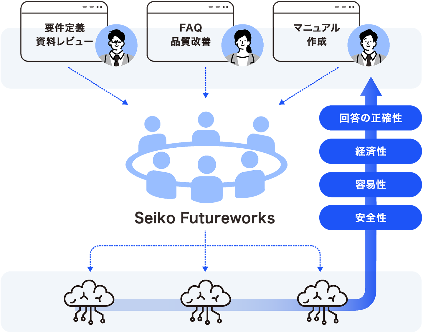 Futureworksを通して利用することで、生成AIの業務利用時の課題となる、「回答の正確性」「経済性」(データ整備の自動化)「容易性」「安全性」(権限にあわせた情報アクセス制御)を解決。