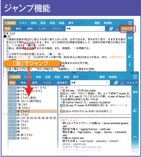 検索結果の表示画面から、新たに引き直さずに、指定した単語の訳語にジャンプできます。
