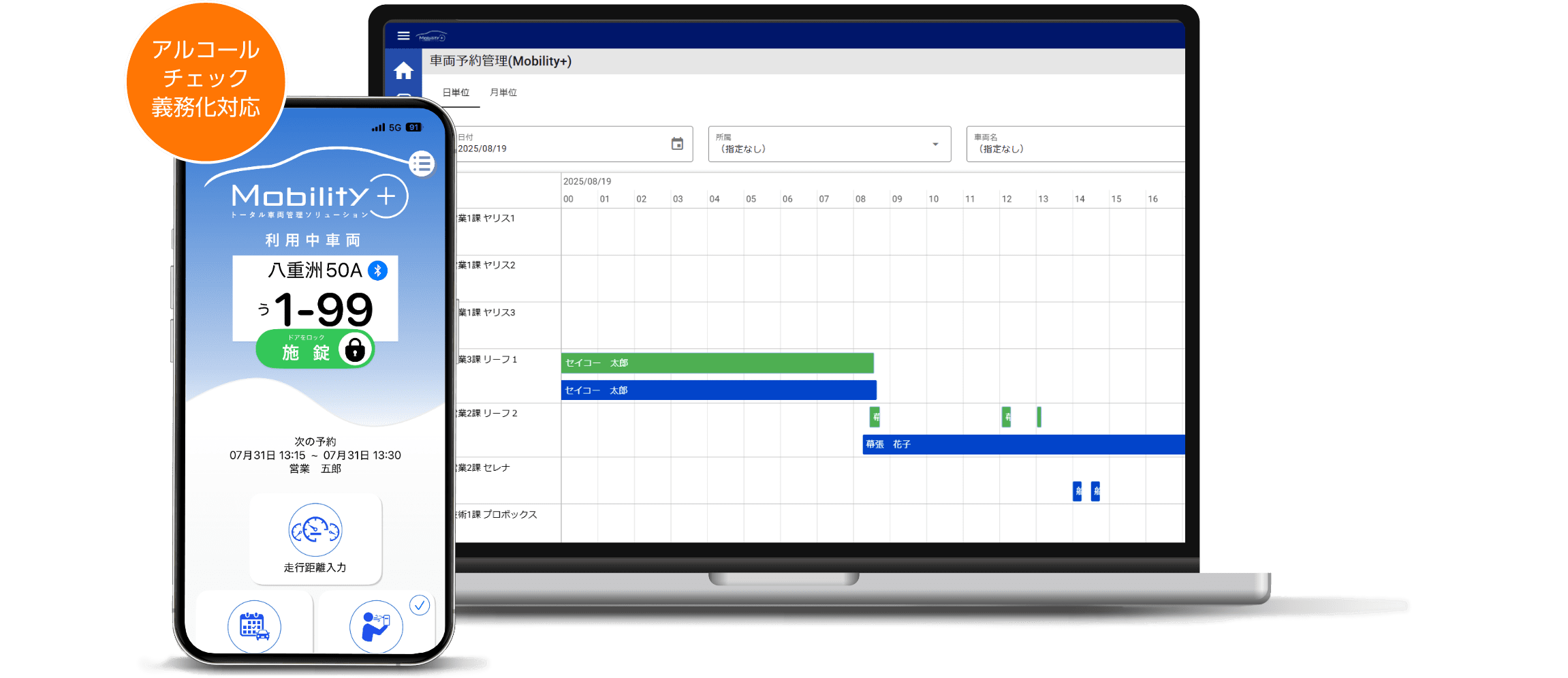 日々のアルコールチェック、車両予約、鍵の受け渡し、運行日報管理など、これまで個別に対応していた業務をまとめてデジタル化。さらに「Mobility+」なら、アルコールインターロックやデジタルキー、位置情報の取得なども対応し、飲酒運転を防止しながら、業務の属人化や人為的ミスを防ぎます。これにより、安全性の強化と管理業務の効率化を同時に実現。管理者の負担を軽減し、社用車運用をスマートに進化させます。