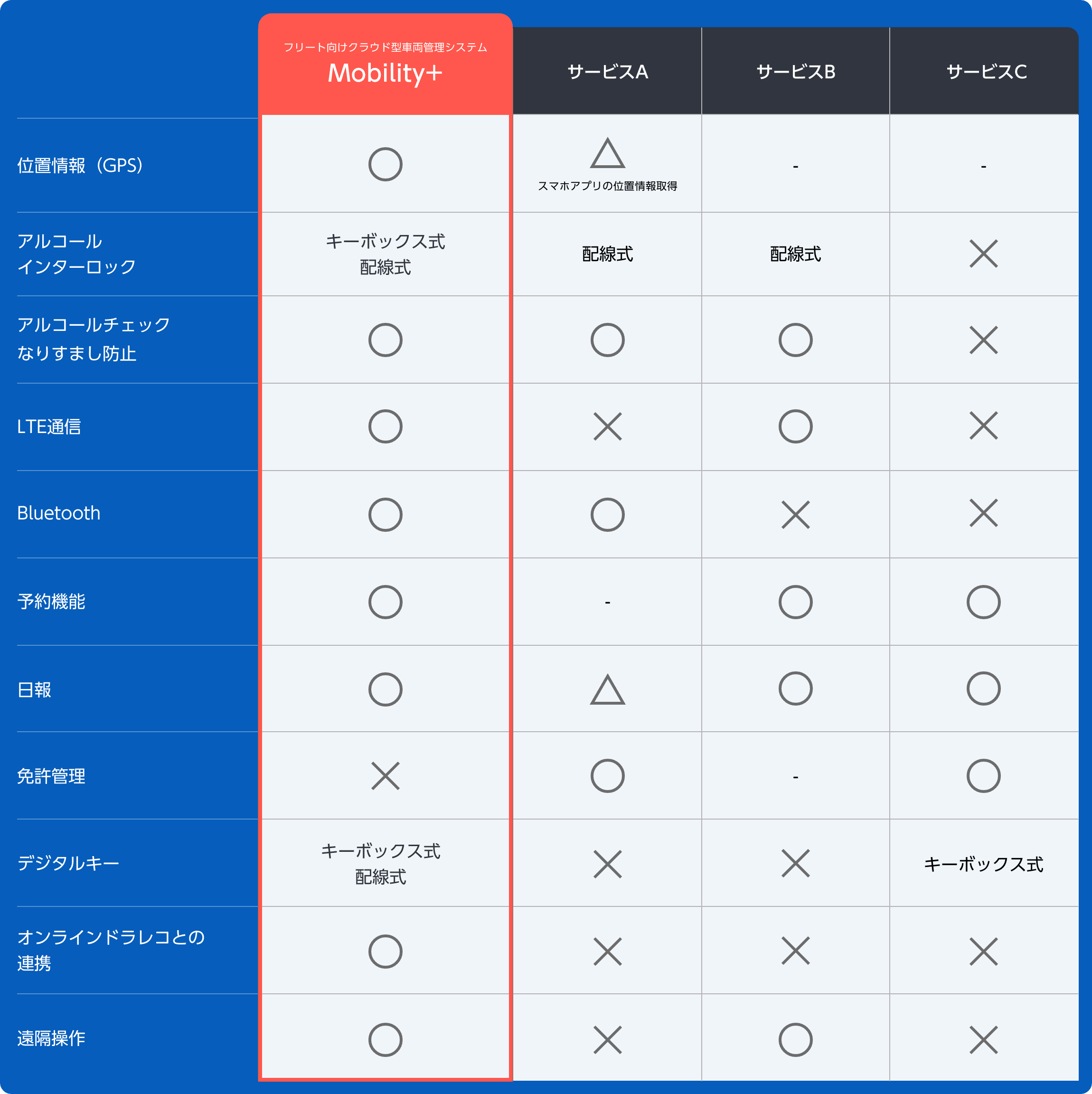 他社様では、ドアロックのみのアルコールインターロック機能もございますが、Mobility+(モビリティプラス)は、車の通信に影響を与えず、安全にエンジンの始動をロックするため、より確実に飲酒運転を防止します。また位置情報はリアルタイムで把握が可能なため、より効率的な運行指示が可能です。 ※LTE通信にも対応しており遠隔での管理や、Bluetooth接続に不具合が起きた場合にもLTE通信経由で動作させることが可能です。